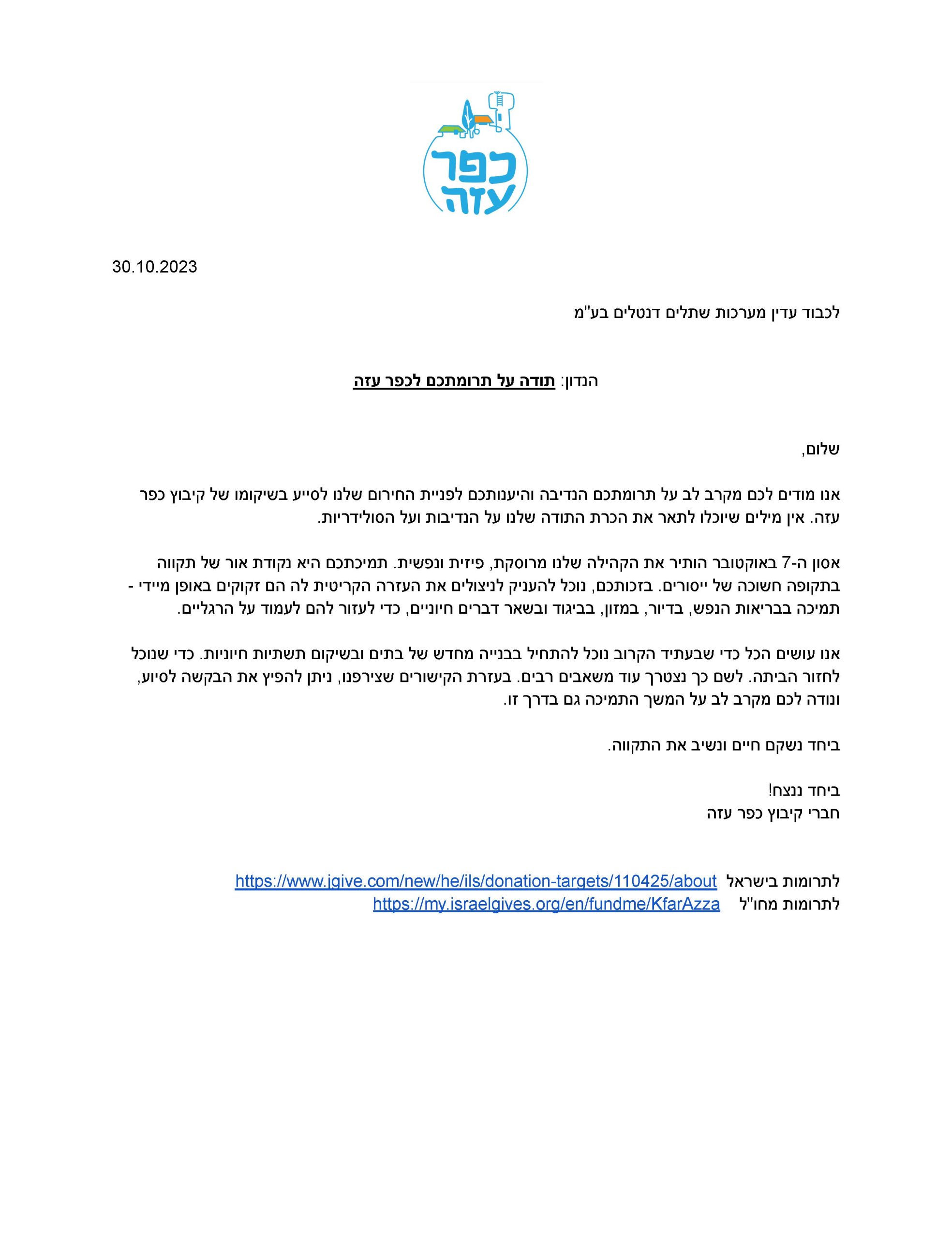 מצורף מכתב תודה מקיבוץ כפר עזה על תרומת החברה ועובדיה לשיקום הקיבוץ.